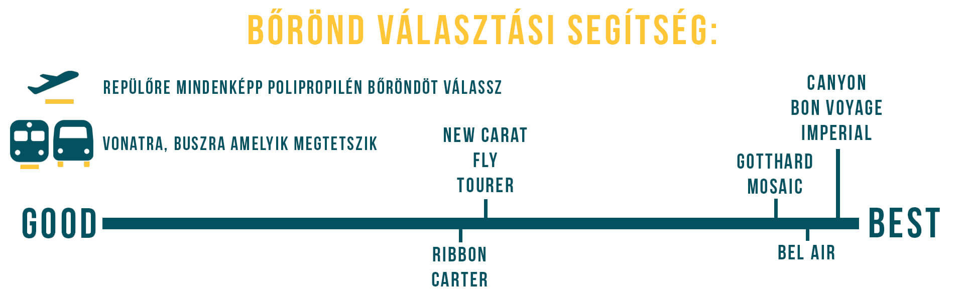 Ha busszal, vonattal illetve kocsival utazunk, akkor a legfontosabb, hogy jó kereke legyen a bőröndnek. Lehet az vászon, vagy kemény bőrönd, igazából teljesen mindegy. A bőröndre mi magunk fogunk vigyázni, mi magunk húzzuk, így nem fog előfordulni a harmadik fél által okozott kár.